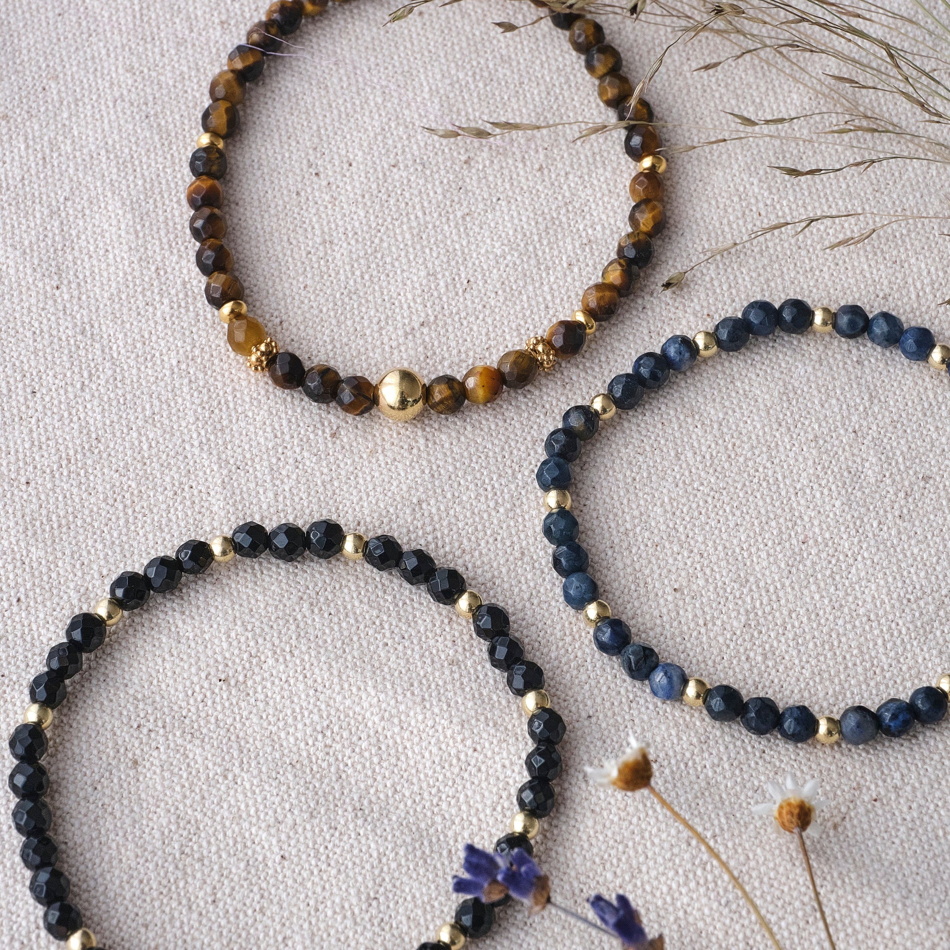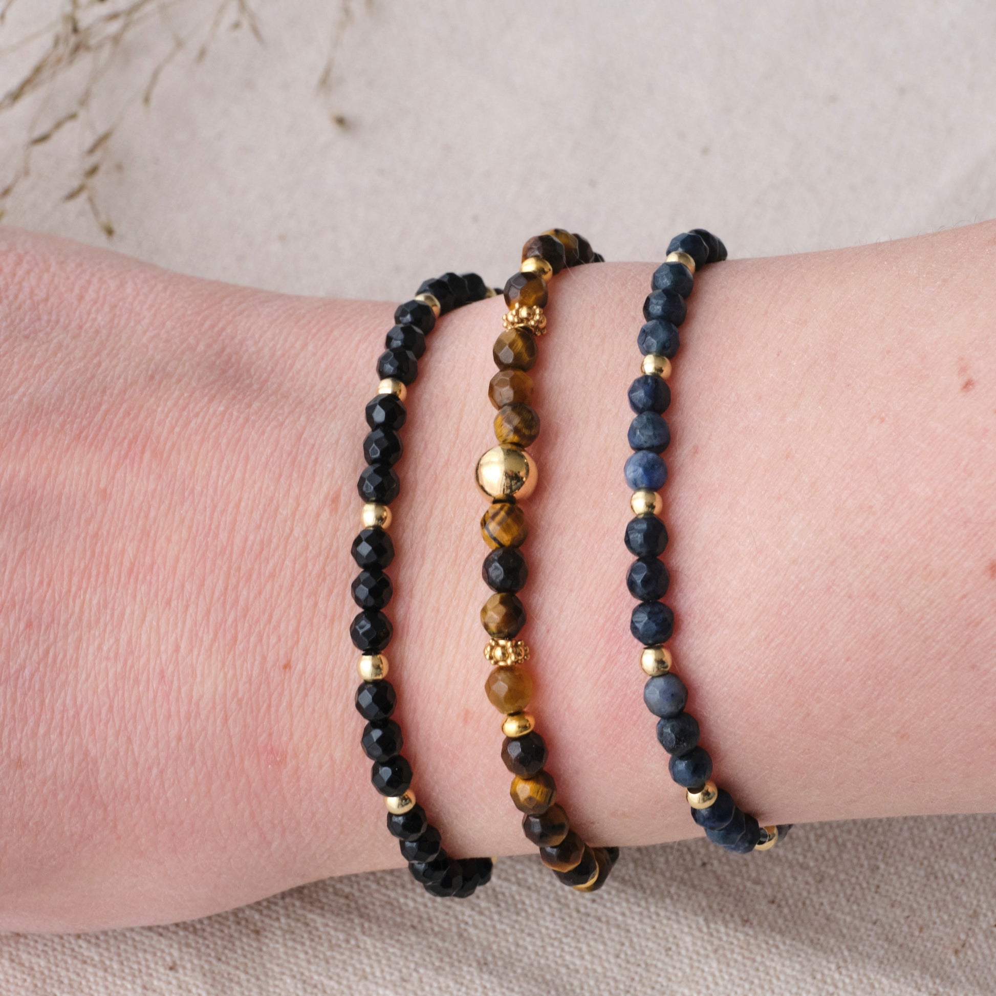 Dieses Armband aus facettierten Dumortierit-Perlen wird durch feine gold Perlen aus Sterling-Silber 925 veredelt.
