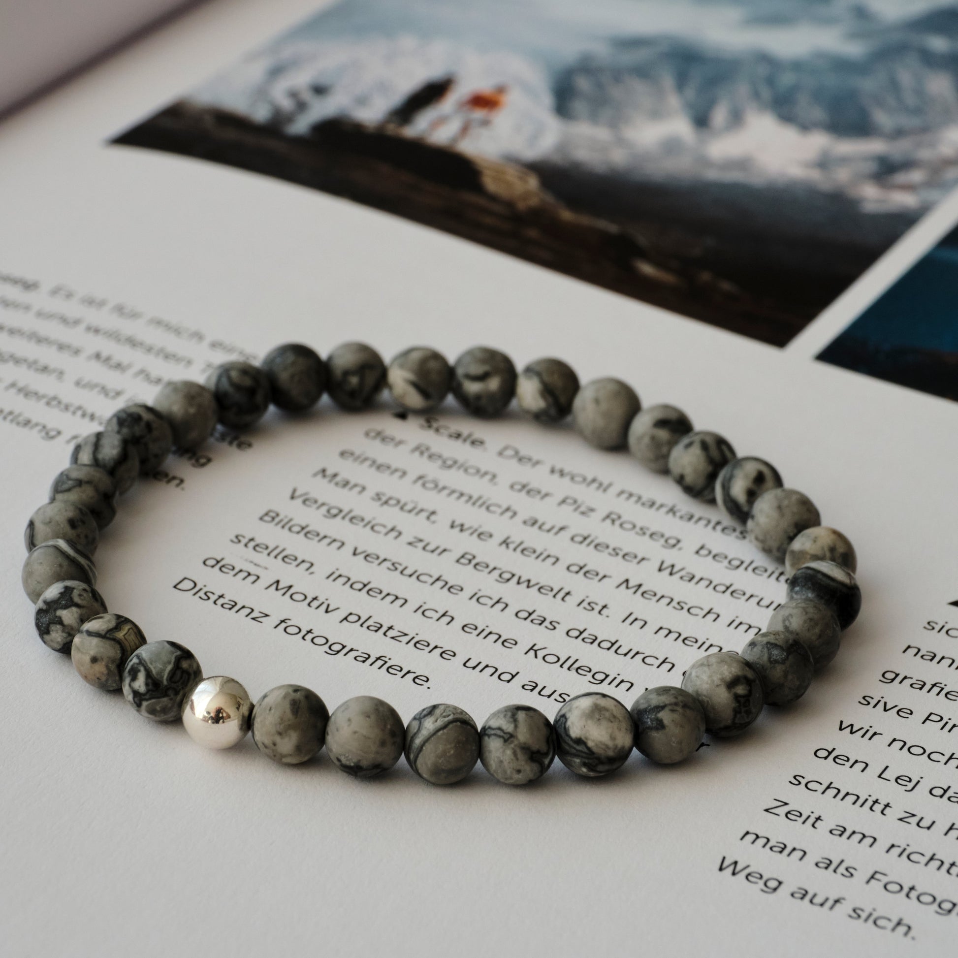 Dieses Herrenarmband besteht aus matten Fossilien-Jaspis-Perlen und wird durch eine Perle aus Sterling-Silber 925 dezent ergänzt. Ein natürliches Schmuckstück mit ruhiger, maskuliner Ausstrahlung und zeitlosem Charakter.