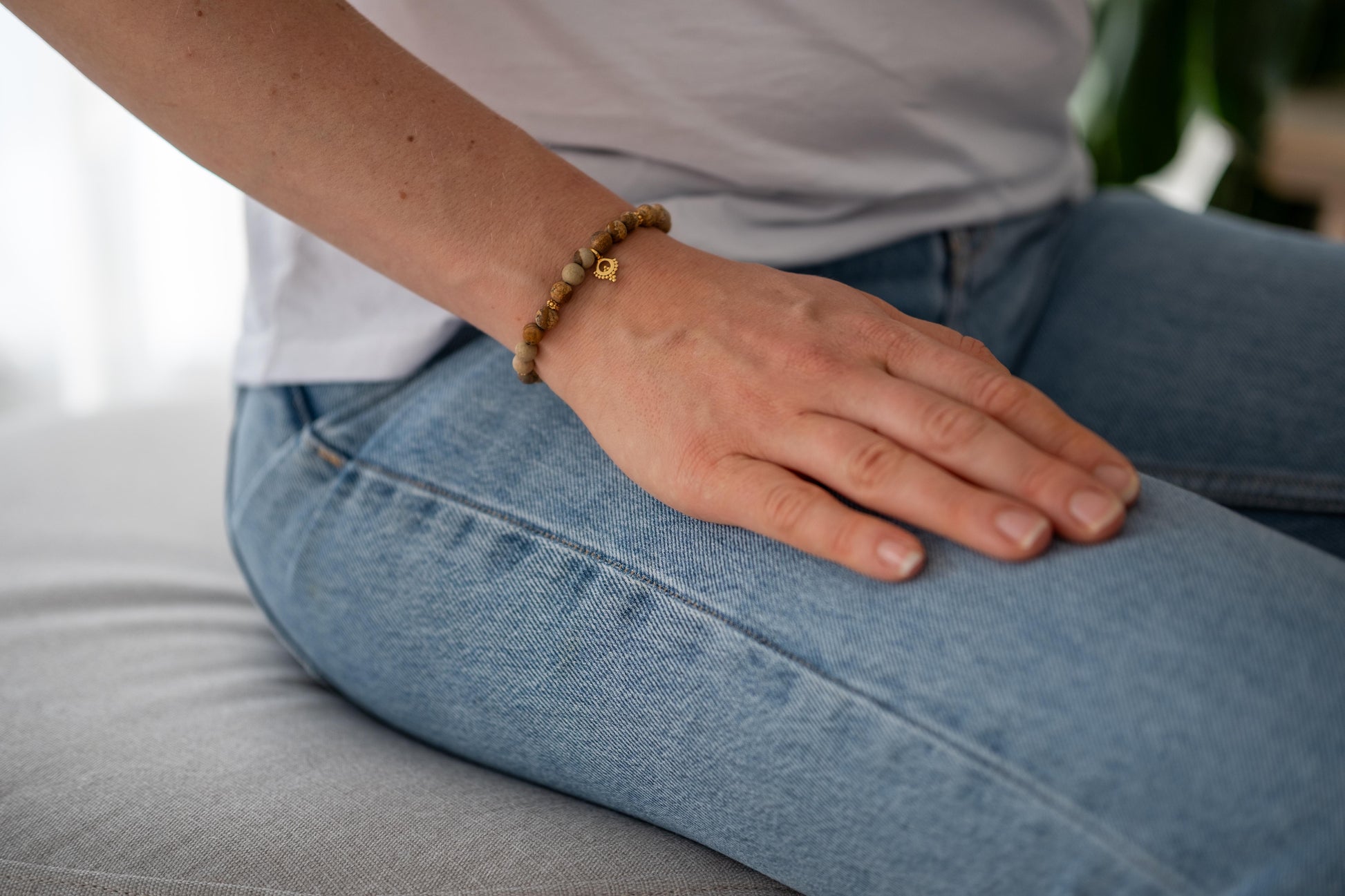 Dieses Armband vereint die erdige Eleganz von mattem Landschaft-Jaspis mit feinen Details aus vergoldetem Sterling-Silber 925. Die sorgfältig ausgewählten Perlen werden durch vergoldete Akzente und einen passenden Anhänger kombiniert.