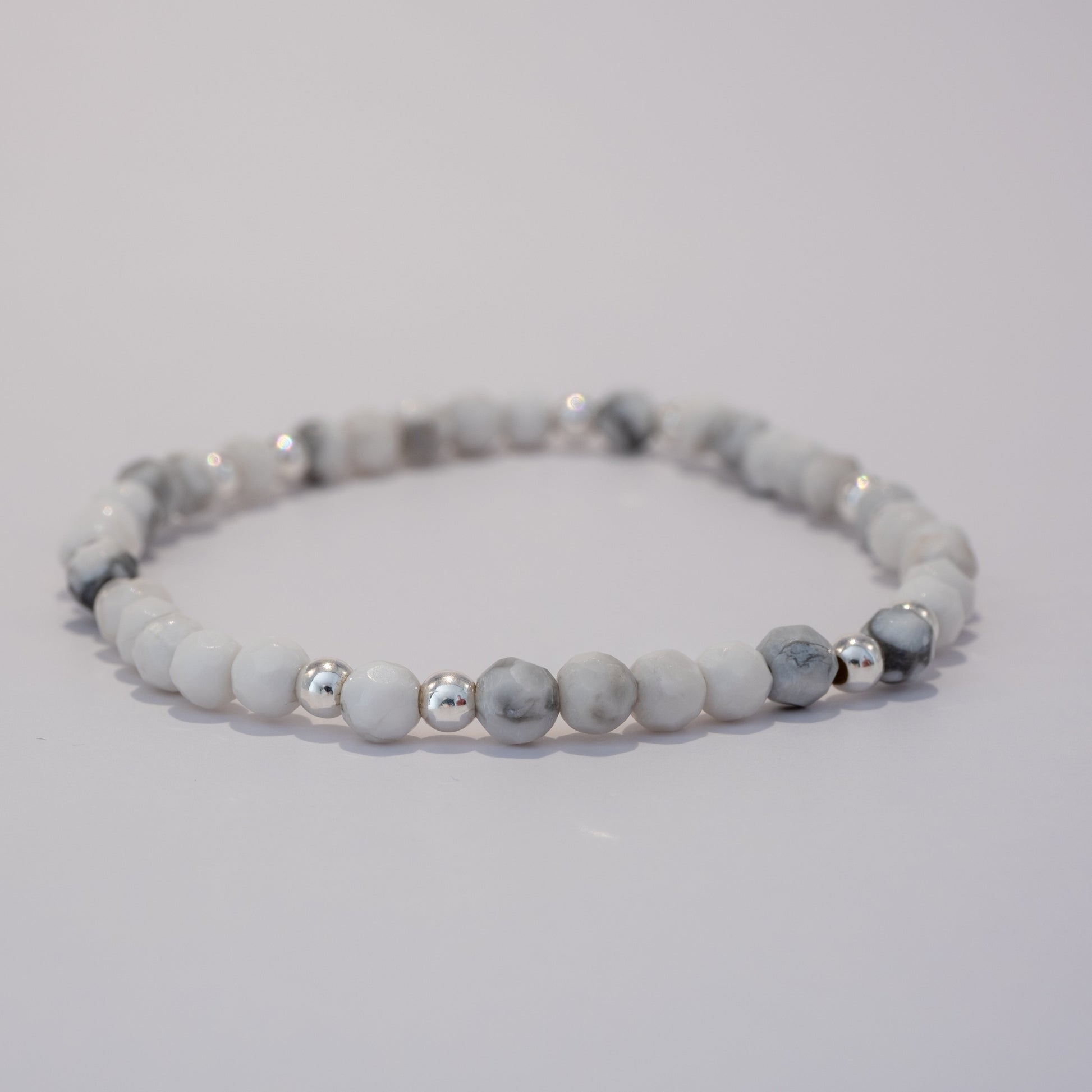 Elegantes Stretch-Armband mit facettierten Magnesit-Perlen und Silberperlen.