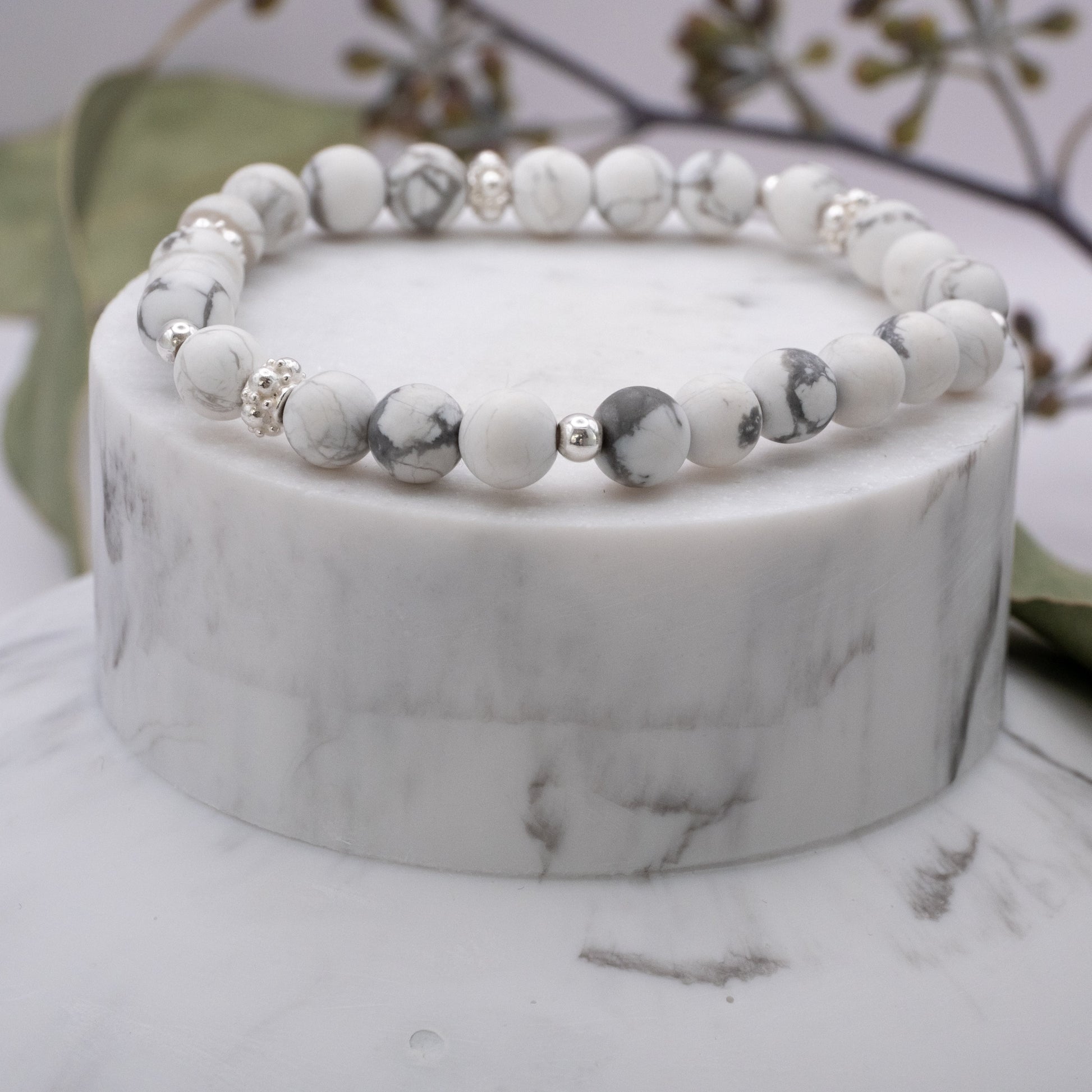 Dieses elegante Stretch-Armband besteht aus matten Magnesit-Perlen und wird durch Perlen aus Sterling-Silber 925 stilvoll ergänzt.