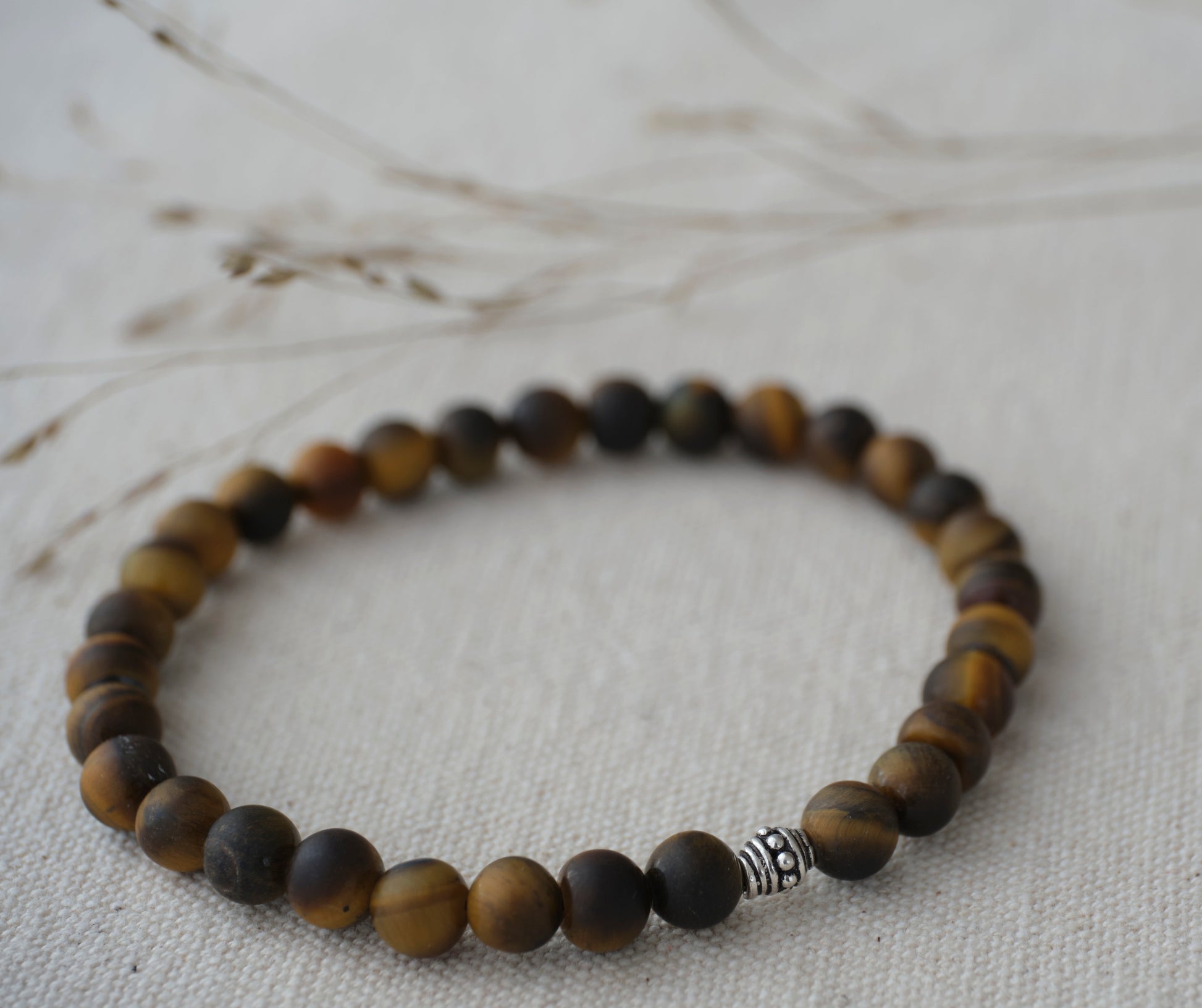 Dieses Herrenarmband besteht aus matten Tigerauge-Perlen. Ein kraftvolles Schmuckstück, das maskuline Eleganz und natürliche Ausstrahlung verbindet.